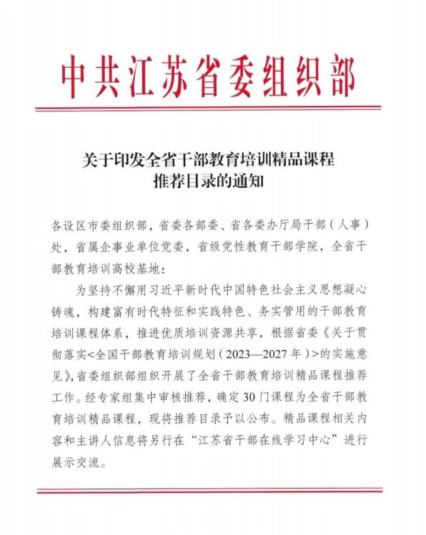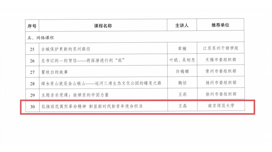 为坚持不懈用习近平新时代中国特色社会主义思想凝心铸魂,构建富有时代特征和实践特色、务实管用的干部教育培训课程体系,推进优质培训资源共享,根据省委《关于贯彻落实<全国干部教育培训规划(2023-2027年)>的实施意见》,省委组织部组织开展了全省干部教育培训精品课程推荐工作。经专家组集中审核推荐,确定30门课程为全省干部教育培训精品课程。其中,雨花台烈士纪念馆与南京师范大学联合申报的《弘扬雨花英烈革命精神 彰显新时代新青年使命担当》入选全省干部教育培训精品课程!