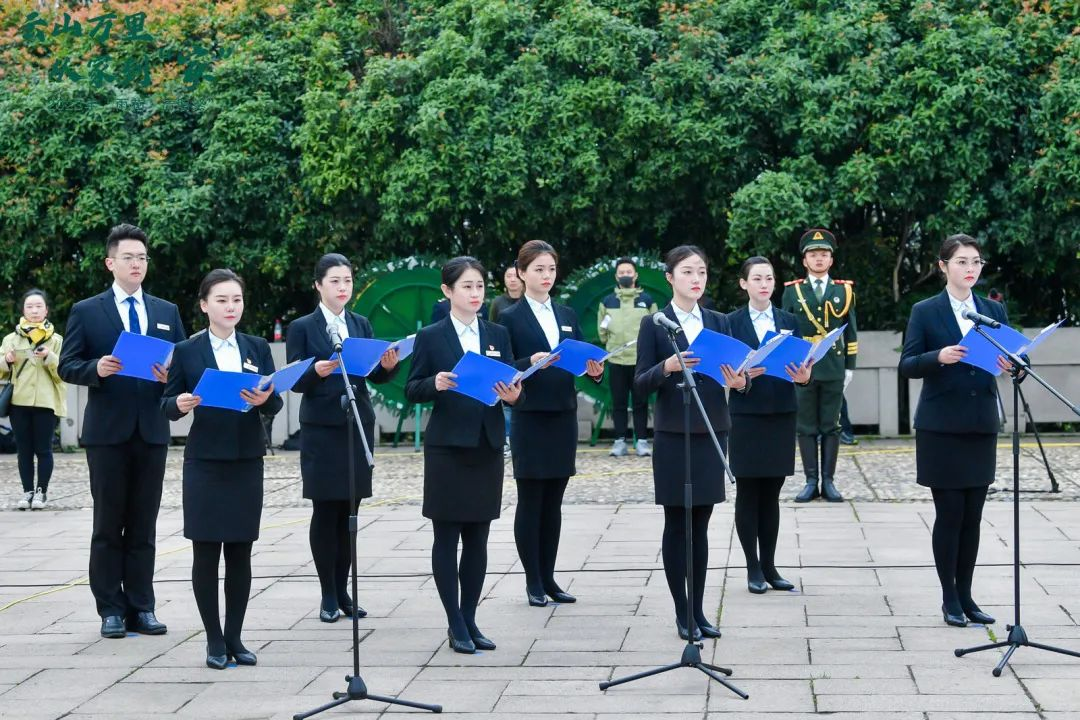上午9:00,雨花英烈亲属代表、雨花台烈士陵园管理局职工代表、司法警察、消防员、医护人员、新业态从业人员、中小学生等各界群众代表近500人在雨花台烈士纪念碑广场举行祭扫仪式,奏唱国歌、默哀、敬献花篮。