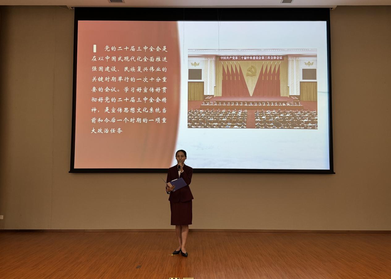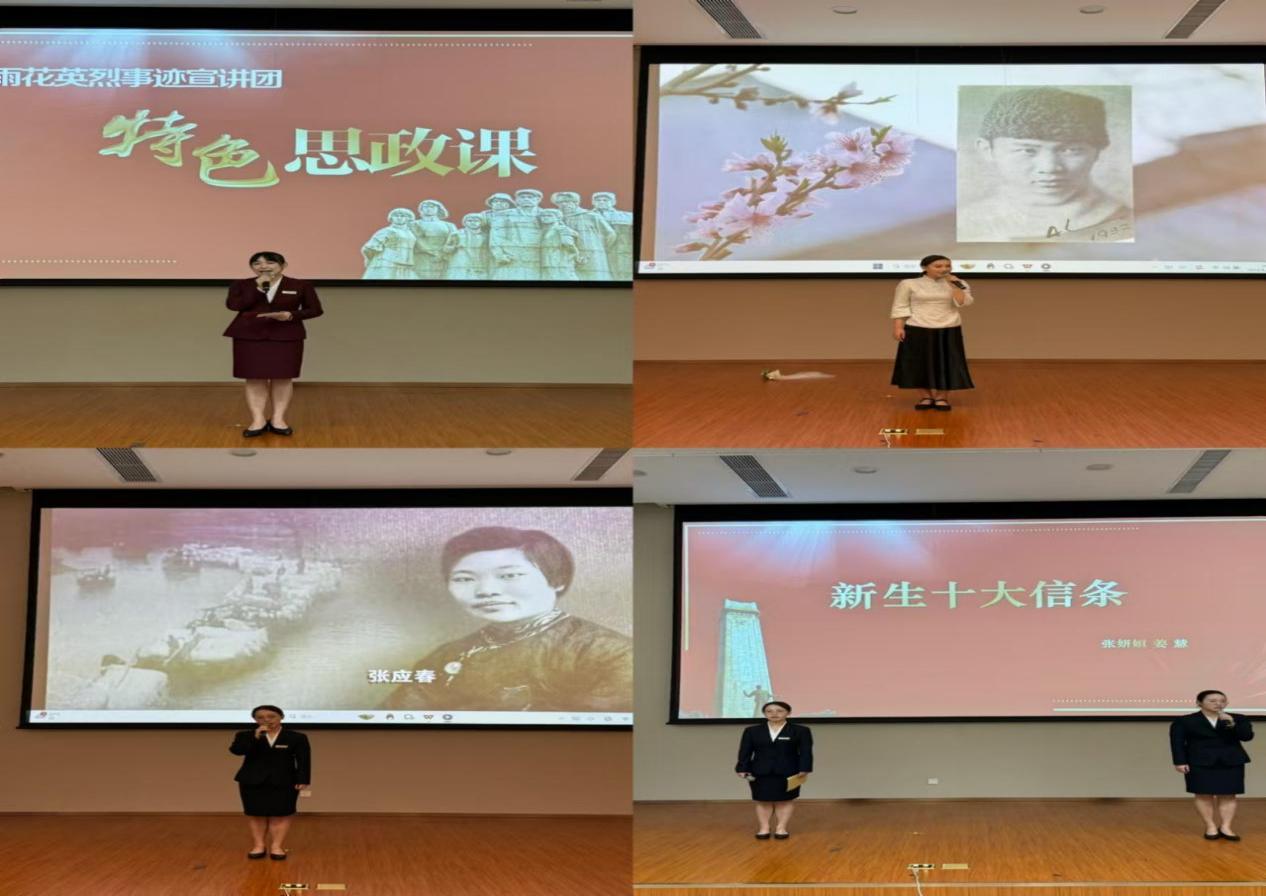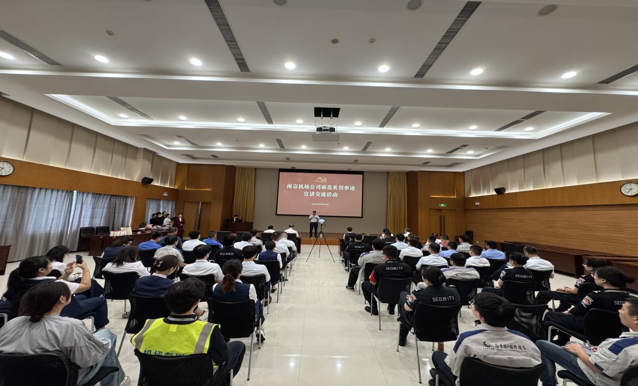 在南京禄口国际机场多功能报告厅,雨花英烈事迹宣讲团开展“党的二十届三中全会精神暨雨花英烈事迹与精神”主题宣讲。现场播放了雨花台宣传片,社教部邢小云同志进行了党的二十届三中全会精神宣传思想文化主题宣讲,冯丽桦、何海燕、姜慧、张妍姮、张凯琳五名同志先后进行《永不凋谢的丁香花》(白丁香烈士)、《熠熠生辉的百年奖章》(张应春烈士)、《19岁的狱中绝笔》(贺瑞麟烈士)、《新生十大信条》(成贻宾烈士)、《飞翔的音乐家》(赵良璋烈士)等雨花英烈事迹宣讲。与会人员沉浸式感悟雨花英烈崇高的理想信念、高尚的道德情操、为民牺牲的大无畏精神。