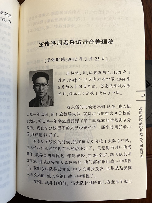 当时,王传洪由于年事较高,记忆已经有些不清楚。来访人员给他送上了溧水当地编写的一本《溧水革命史》。老人翻阅之后,沉睡的记忆一下被唤醒:“这里写得不对!”书中写道:“大队长汤万益始终坚持在前沿战壕指挥,不幸中弹,壮烈牺牲。”老人指出这个细节的误差:“汤大队长不是在战壕里牺牲的,是带着一个排反冲锋出去时牺牲的。一大队一中队的同志们,集中火力、组织兵力把大队长的遗体抢回来了。铜山战斗,牺牲最大的是我们一大队。”