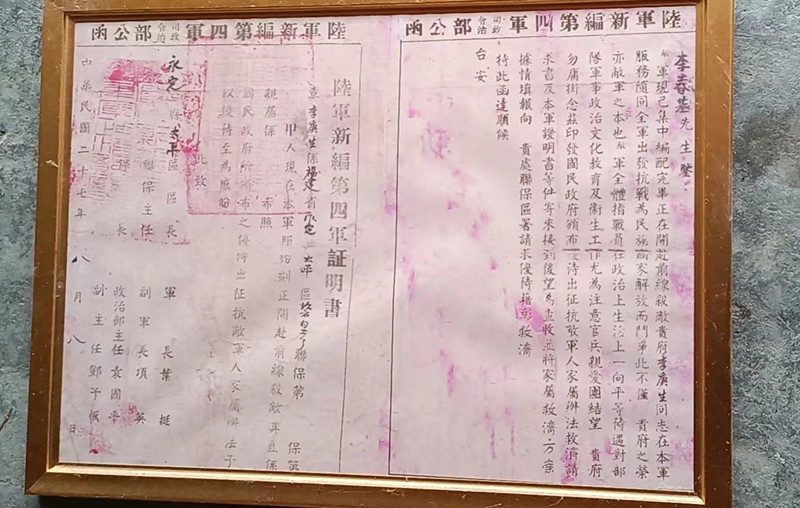父亲李庚生当年也被舅公招募入伍4年,参加了云台山战斗,突围成功死里逃生之后,又历经皖南事变与部队失散,辗转回到家乡,在家乡终老。此次李旺声来宁也出示了父亲李庚生的陆军新编第四军证明书,希望在云台山抗日烈士陵园展馆资料中找到父亲名字,可惜没有找到。
