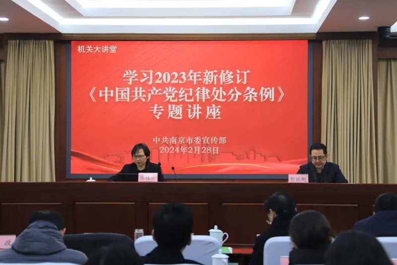 为进一步增强党员干部学习贯彻《中国共产党纪律处分条例》(以下简称《条例》)的政治自觉、思想自觉和行动自觉,2月28日下午,南京市委宣传部邀请江苏省委党校廉政教育研究中心主任张桂珍教授,围绕新修订的《中国共产党纪律处分条例》作专题辅导。市委宣传部常务副部长彭振刚同志主持学习会,部务会各位成员、机关全体党员干部参加。