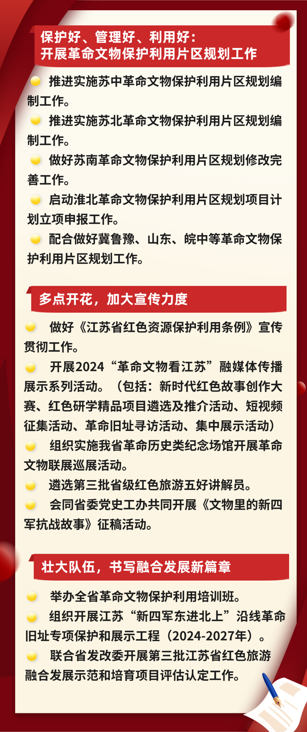 如何将春节期间红色旅游热度持久延续?更精准地将红色基因传递给游客?更高效地赓续红色血脉?是摆在江苏文旅人面前的一道考题。2024年,省文化和旅游厅将进一步加强革命文物保护利用,传承弘扬红色文化,持续推进红色旅游融合发展。我们将着力在以下几方面播种耕耘: