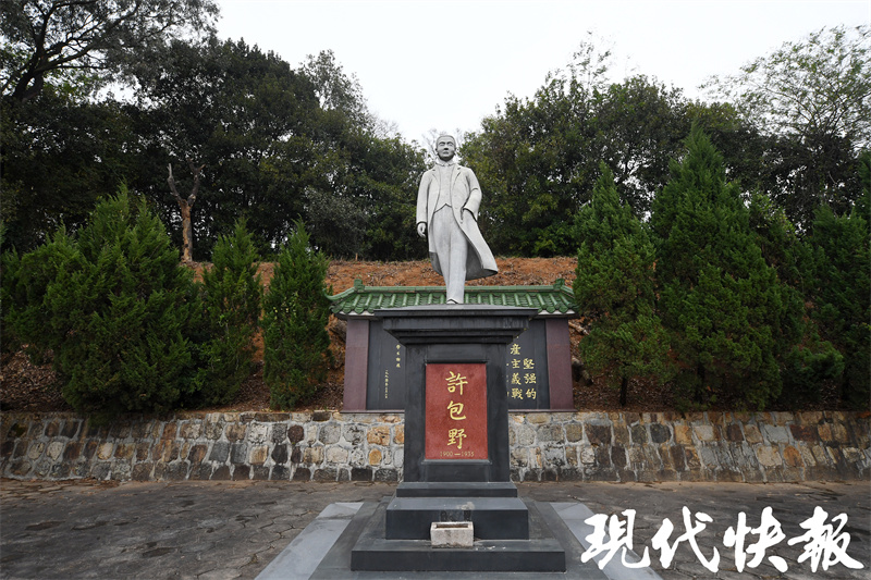 清晨,登上许包野烈士陵园高高的台阶,一行人瞻仰烈士塑像、鞠躬、献花。遥望这尊塑像,许包野身着西装风衣,风度翩翩,目光坚毅。