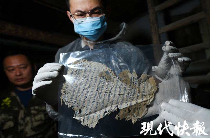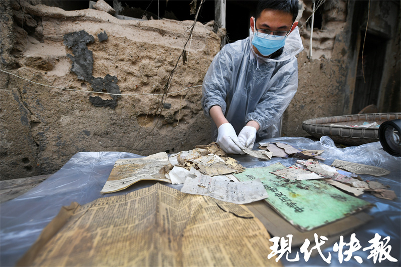 在老屋看守者的指引下,雨花台烈士纪念馆工作人员在老屋阁楼里发现了一口樟木箱。这口尘封已久的箱子里,存放着一批泛黄的纸质资料,包含书籍、书信等。由于年代久远,这些资料有的纸页面掉落,有的已被书虫蛀蚀。经过一上午的初步整理,工作人员将这些纸质资料分别装进了一个个透明的塑料密封袋里。