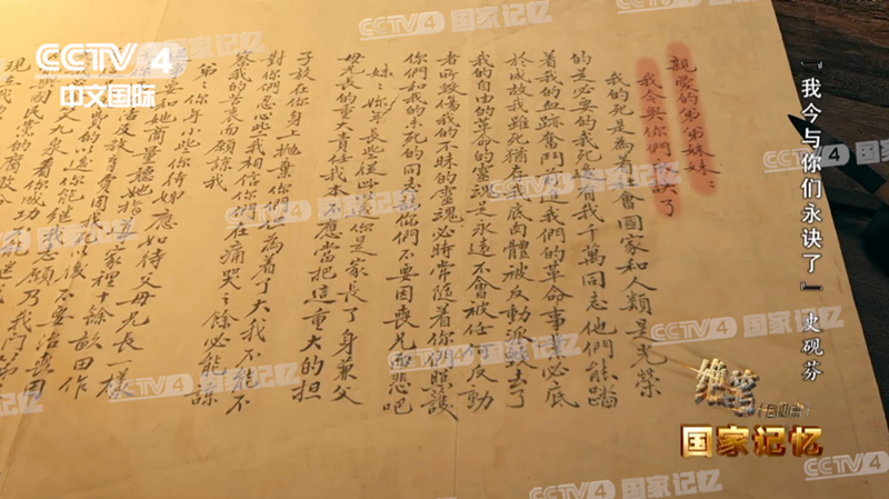 史砚芬牺牲后,弟弟妹妹冒着危险为兄长收殓,这封给弟弟妹妹的绝笔信就藏在内衣口袋中。仔细阅读着大哥留下的绝笔,他们将这最后的嘱托铭刻于心。妹妹嫁给了北伐革命军人,弟弟跟随大哥的足迹参加了革命,为人民的解放和国家的建设贡献自己的力量。