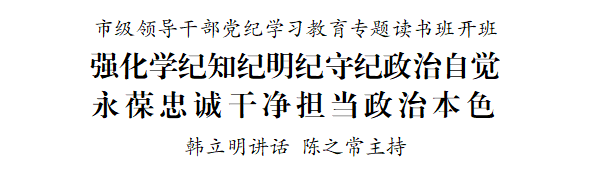 4月25日,市委召开市级领导干部党纪学习教育专题读书班暨市委理论学习中心组学习会,深入学习习近平总书记关于加强党的纪律建设的重要论述,原原本本、逐章逐条学习《中国共产党纪律处分条例》,进一步增强政治定力、纪律定力、道德定力、抵腐定力。市委书记韩立明出席并讲话。市委副书记、市长陈之常主持开班式。