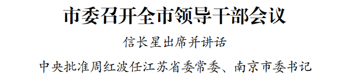 信长星强调,南京在全省改革发展大局中处于重要位置、肩负重要责任,要进一步坚定信心、鼓足干劲、勇挑大梁,在推进中国式现代化江苏新实践中更好彰显省会担当、作出示范引领。要深入学习贯彻落实习近平总书记重要讲话精神,自觉把南京工作放到“两个大局”的坐标中谋划推进、抓好落实,坚定不移沿着总书记指引的方向前进,以实际行动和实际成效做到“两个维护”。要牢牢把握高质量发展这个首要任务,坚持把创新作为发展的第一动力,进一步深化对内对外开放,更好发挥产业、区位、科教、人才等优势,不断塑造发展新动能。要坚持以人民为中心的发展思想,把强化基层治理和民生保障摆在更突出位置,着力解决群众急难愁盼问题,持续防范化解各类风险,在特大城市治理上实现新提升。要坚决扛起全面从严治党重大政治责任,深入落实新时代党的建设总要求,始终坚持“严”的主基调,提振干事创业精气神,持续巩固风清气正的良好政治生态。省委相信以周红波同志为班长的南京市委领导班子,一定能够团结带领全市广大干部群众,齐心协力、锐意进取,为谱写“强富美高”新江苏现代化建设新篇章作出新的更大贡献。