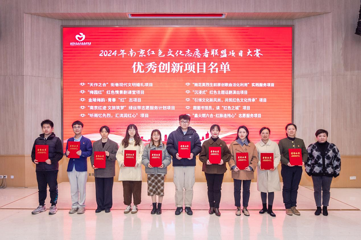 在创新项目展示环节,来自南京红色文化志愿服务站点、吴侯社区新时代文明实践站的志愿者们带来《红色家书》诵读节目,让现场观众深切感受到红色文化的魅力与力量。南京师范大学“金陵梅韵·青春‘红’志”项目团队则从“红色教育、红色场馆、红色文艺、红色实践、红色研学”五个角度,展现了团队探索金陵红梅“五瓣梅韵”红色传承路径的历程,赢得现场阵阵掌声。