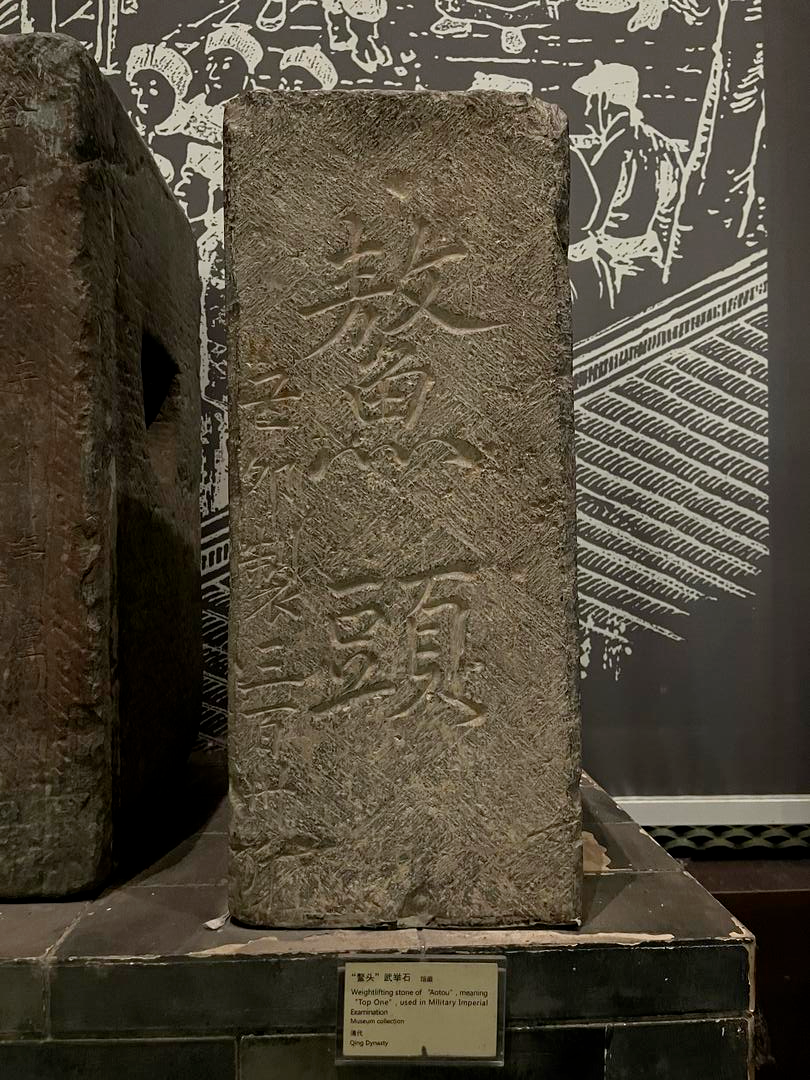 在古代,除了文举,还有武举。记者看到,该馆还收藏多方清代武举考试中常见器具武举石。馆方介绍说,清代科举考试的外场技勇类包括射弓、舞刀、掇石三项,其中石头的重量为二百斤、二百五十斤、三百斤。参加武举考试的考生按自身实力选择重量,测试时必须将石头提举至腰间,并且要停留一段时间才可以判为合格。其中一块带有“鳌头”字样的武举石为晚清时武举考试用石,重达330斤,上刻“鳌头”二字,寓意在科举考试拔得头筹,能举起此物者,将在考试中脱颖而出。