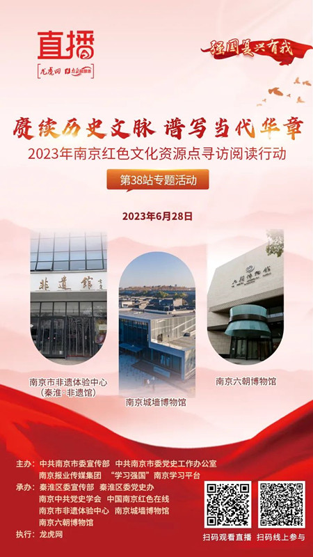 6月28日,南京红色文化资源点寻访阅读行动第38站以“赓续历史文脉 谱写当代华章”为主题开展专题活动,探访南京市非遗体验中心(秦淮·非遗馆)、南京城墙博物馆、南京六朝博物馆等城市文化地标,通过开展实境宣讲、分享交流,引导广大党员干部群众更好担负起新的文化使命,以文化为重要支点推进城市高质量发展。