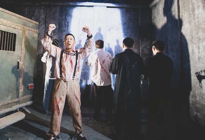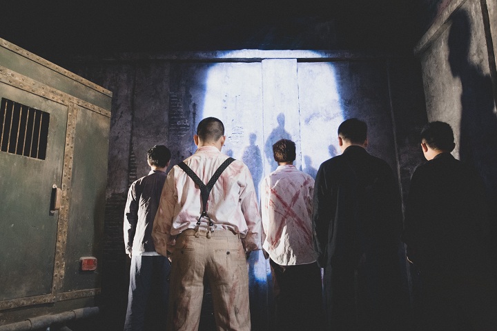 弹痕斑斑的刑场上,北平五烈士扮演者背对观众,而他们的影子被囚车灯光拉得很高很高……