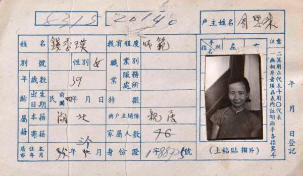 如今,梅园新村纪念馆里,还珍藏着一张泛黄的户口卡,上面就有钱瑛的名字和照片。