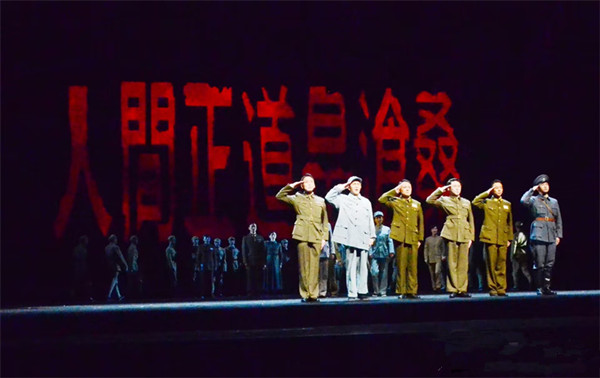 舞台上方,三幅象征远去记忆的“残片”随剧情不断升降,20余年波澜壮阔的历史画卷次第展开;舞台中央,一个直径13米的转台如同历史的年轮一般,不停迁移着场景,将一幕幕故事推向高潮。剧终,“人间正道是沧桑”七个大字徐徐落下,伴随着磅礴大气的音乐,留给观众震撼的观感和无尽的回味。