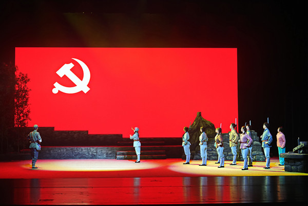 为了彰显董振英对党忠诚、不辱使命的光荣品格,淮海戏《刑场上的党课》在强化党性的同时也表现出了董振英丰富的情感世界。敌人的严刑拷打和威逼利诱贯穿全剧,同时一面鲜红的党旗也贯穿始终,“狱中受审”“林下党课”“月夜纳鞋”“光荣入党”“刑场党课”“慷慨就义”等桥段中,党旗永远是不能缺少的符号:林下党课的红旗带给董振英人生的转折,党旗下的宣誓让董振英终生追随,在狱中怀里珍藏的党旗温暖着董振英的心房,刑场上董振英热血映红了鲜红的党旗……这正是董振英不变的信仰,正是共产党人一生的追求。