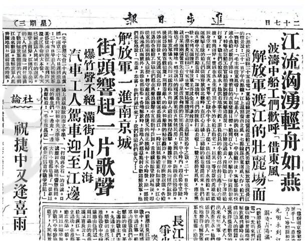 记者看到,1949年4月27日的《进步日报》版面上,以较大字号登载了“解放军一进南京城,街头响起一片歌声,爆竹声不绝,满街人山人海”的壮观场景。该新闻同时记述,解放军从浦口渡江,登上南京南岸时,“江南汽车公司的工人们便乘着一列列贴满了欢迎解放军标语的汽车到江边欢迎。”并且,新闻之中记载南京解放之际,“当解放军人马奔腾地向城区前进的时候”,南京市的大中学校的学生们在路上欢迎,“口号声经久不绝地响彻街头”。