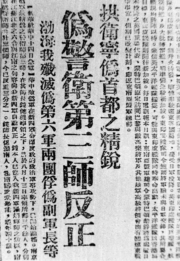 《解放日报》报道汪伪警卫三师反正