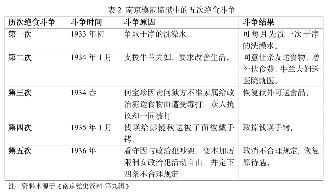 狱中恶劣的生存环境是促使革命女性开展斗争的直接原因。以南京模范监狱中的五次绝食斗争为例,都是为了争取更好的生存环境,诸如干净的洗澡水、正常的伙食、基本的床具卧具保障等等。经过她们的顽强抵抗,斗争基本取得胜利。
