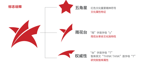 通过雨花台“雨”字首字母“y”及“台”字首字母“T”巧妙组成五角星(红色文化精神符号)为第一视觉元素,体现了logo的红色文化属性,同时也体现了雨花台革命文化的独特性,字母“T”还是智库英文“THINK TANK”的首字母,体现了雨花台红色文化研究院是智库属性。