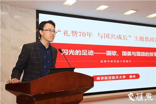此次活动由“学习强国”江苏学习平台联合新华报业传媒集团策划推出,引导青少年树立和坚持正确的历史观、民族观、国家观、文化观,帮助青少年更好地肩负历史使命和时代责任,成为维护祖国统一、民族团结、社会稳定的有生力量。来自南京航空航天大学的康冲老师给金中实小的少先队员们上了一节鲜活的主题思政微课《闪光的足迹——国歌、国徽与国旗的故事》。“你们知道国徽上有哪些元素吗?1949年开国大典的时候,国徽还没有设计好,因为确实很复杂很精心......”康老师循循善诱,通过丰富的图片、视频和讲述,让每个孩子对祖国的历史更加了解。少先队员们手拿红色小国旗认真听讲,“没想到原来我们的国旗设计还有那么多有趣的故事,几十次更改设计稿,最终有了现在的《五星红旗》”。