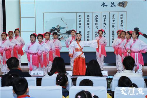 红色故事我来说!金中实小五(1)班全体同学和老师一起带来诗朗诵《少年强则国强》和音诗画《木兰诗》。“我们是祖国美好的明天,我们是祖国未来的希望!一句流传千古的豪迈誓言在回响......”《少年强则国强》的领诵胡桉萱和徐尚淳告诉记者,他们认真练习了一个多星期,特别喜欢这篇诗歌。