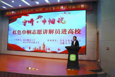 4月20日下午,由南京师范大学和南京市妇女联合会主办的2021年“红韵”女生节开幕。开幕式上,女大学生们聆听了巾帼志愿者带来的党史故事。