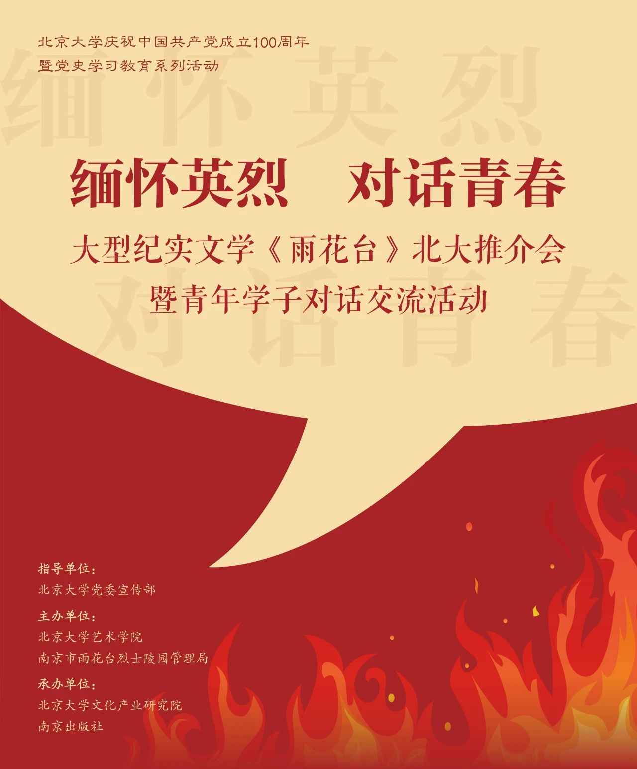 5月28日下午,“缅怀英烈 对话青春”大型纪实文学《雨花台》北大推介会暨青年学子对话交流会在北京大学举办。据悉,该活动是北京大学庆祝中国共产党成立100周年暨党史学习教育系列活动之一,由北京大学党委宣传部指导,北京大学艺术学院、南京市雨花台烈士陵园管理局主办,北京大学文化产业研究院和南京出版社联合承办。活动由北京大学文化产业研究院副院长向勇教授主持。