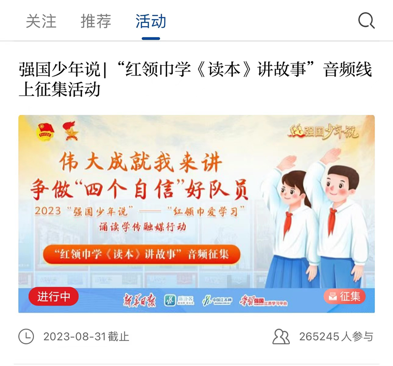 夏日炎炎,广大少先队员们在丰富多彩的活动中乐享暑期生活。习近平总书记强调,“孩子们成长得更好,是我们最大的心愿。”为了让少先队员度过一个有收获、有意义的假期,自7月1日起,南京团市委、南京市少工委、新江苏·中国江苏网和“学习强国”江苏学习平台联合开展了2023年度“强国少年说”——南京“红领巾爱学习”诵读学传融媒行动,反响热烈。