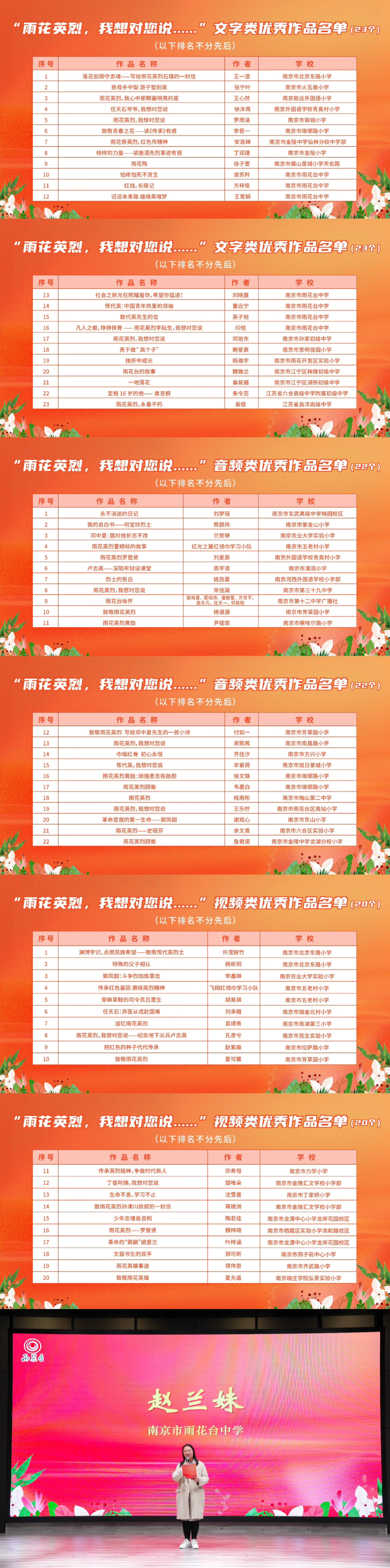在“雨花英烈,我想对您说……”作品征集活动中,主办方共收到千余份参赛作品。这些优秀作品有的情真意切,有的构思奇妙,有的文笔优美,有的制作精良,它们由全市近百所中小学校的学生原创完成。参与过程中,许多同学从学习《传承》这套书起步,走进雨花台,线上线下研究英烈的资料,深入了解当时中国的历史背景,并主动加入了雨花台“红领巾讲解队”,成为了英烈精神的小小弘扬者,充分展现出青少年积极从英烈事迹中汲取奋进力量的无限热情。最终,经过专家评委的优中选优,共有23篇读后感、22部音频和20部视频脱颖而出,被评为优秀作品!当天这些优秀作品也在中国南京红色在线网站及小程序正式上线。优秀作品名单如下: