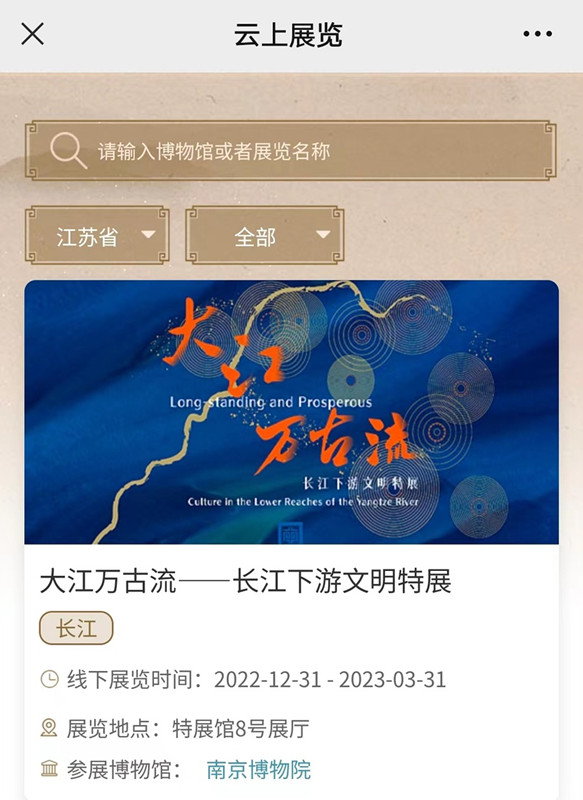 在“云上展览”版块,想看哪个博物馆、哪个展,可手动寻找,也有搜索功能,非常方便。记者注意到,“云上博物”对于观众来说还有一大利好,就是可看线下已撤的展览。比如南京博物馆的“大江万古流——长江下游文明特展”线下展览时间为2022年12月31日—2023年3月31日,有的人在此时间段没有来得及观看,那在“云上博物”依然可以观看此展,弥补没有到现场观看的遗憾。“参观预约”版块则可以预约参观江苏一些博物馆。