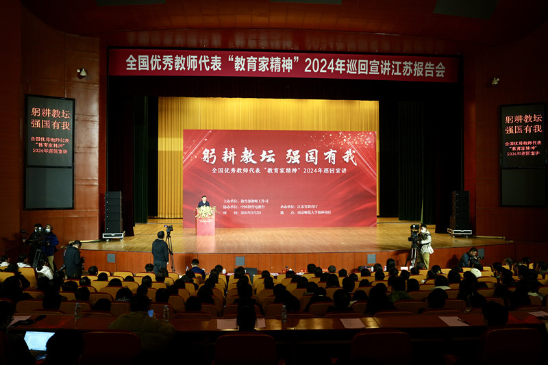 现代快报讯(记者 于露)3月2日,全国优秀教师代表“教育家精神”2024年巡回宣讲江苏报告会在南京师范大学举行,来自全国各地的6位宣讲团成员作教育家精神宣讲报告。1300余名师生代表现场聆听,会场里不时响起阵阵掌声,许多人被宣讲团成员的事迹打动,流下感动的眼泪。
