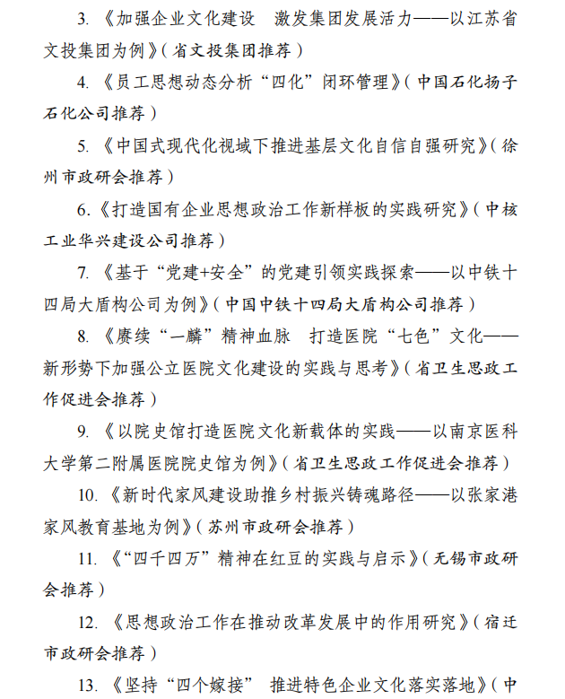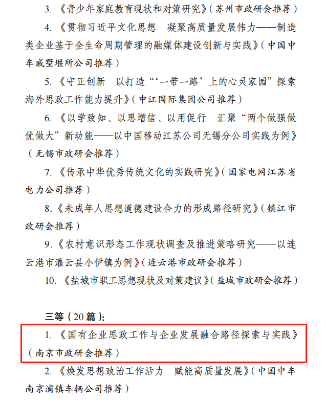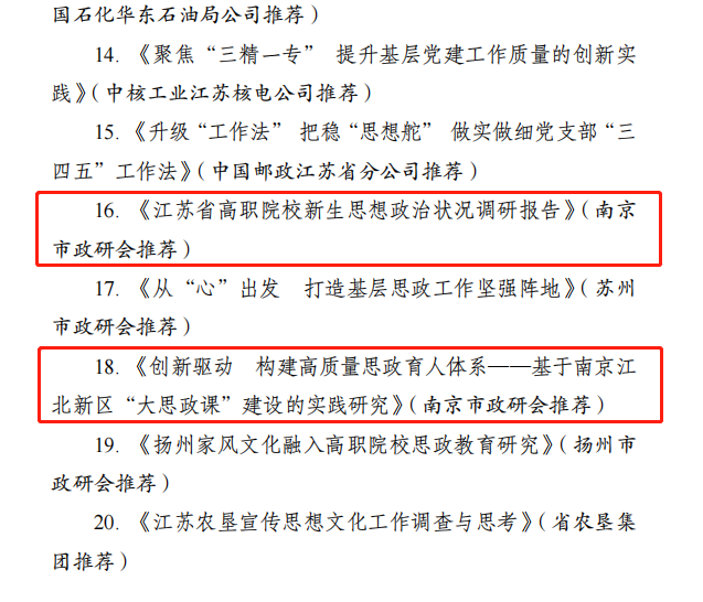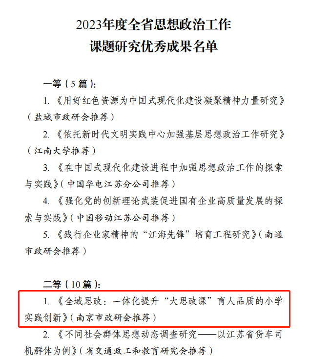 3月8日,2023年度全省思想政治工作课题研究优秀成果名单公布,378篇报送作品中,全省共评选出35篇入选作品,南京市政研会推荐作品中有4篇获奖。其中,《全域思政:一体化提升“大思政课”育人品质的小学实践创新》被评为二等优秀成果,《国有企业思政工作与企业发展融合路径探索与实践》《江苏省高职院校新生思想政治状况调研报告》《创新驱动 构建高质量思政育人体系——基于南京江北新区“大思政课”建设的实践研究》3篇作品被评为三等优秀成果。