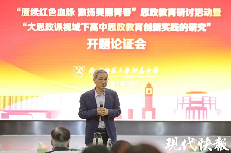 将思政教育融入物理课、数学课、历史课……4月26日下午,南京师范大学附属中学举行“赓续红色血脉 激扬美丽青春”思政教育研讨活动暨“大思政课视域下高中思政教育创新实践的研究”开题论证会。展示思政教育课程与活动,并进行开题论证。