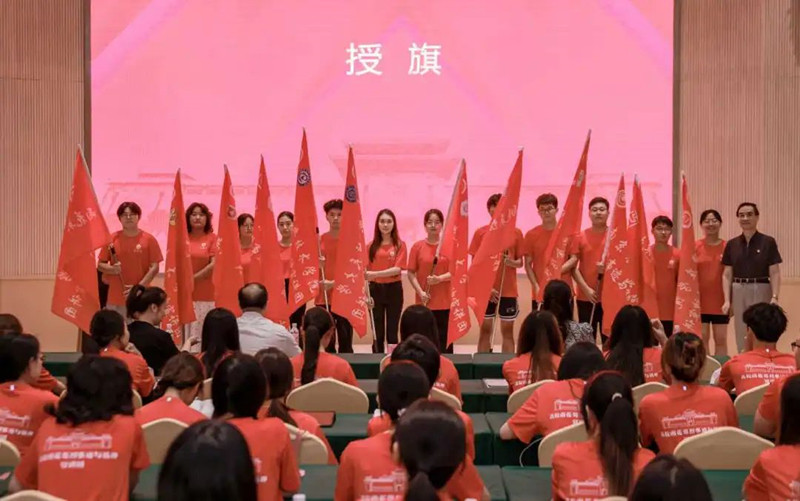 天地英雄气,千秋尚凛然。无数革命者接续奋斗,用生命著书,为真理立传。以先烈志,铸中华魂,革命先辈的红色精神正是滋养后人的精神食粮。结营仪式上,雨花台烈士陵园管理局副局长、党组成员葛俊杰对宣讲团成员提出期望,做一个思考者、行动者、奉献者,成长为担当民族复兴大任的时代新人。雨花台烈士纪念馆为24所联盟高校宣讲团团长、副团长颁发聘书,任华轶先生为各高校宣讲团授旗。挥舞的红旗承载着革命者的信仰,传递着先辈的期望,同学们从烈士亲属的手中接过雨花英烈事迹与精神志愿宣讲的旗帜,接过弘扬革命精神、赓续红色血脉的时代重任,誓做新时代红色基因的传承者。
