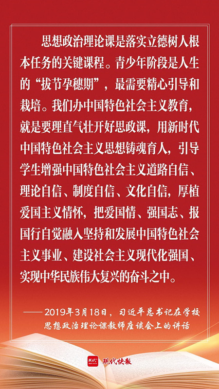 “青少年阶段是人生的‘拔节孕穗期’,最需要精心引导和栽培。”习近平总书记强调,我们办中国特色社会主义教育,就是要理直气壮开好思政课,用新时代中国特色社会主义思想铸魂育人,引导学生增强中国特色社会主义道路自信、理论自信、制度自信、文化自信,厚植爱国主义情怀,把爱国情、强国志、报国行自觉融入坚持和发展中国特色社会主义事业、建设社会主义现代化强国、实现中华民族伟大复兴的奋斗之中。