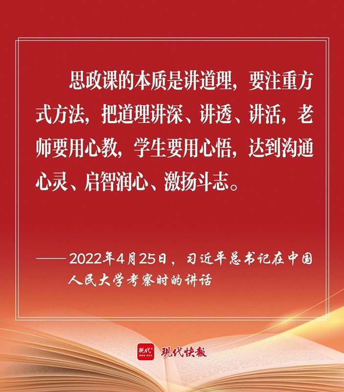 2022年4月25日,习近平总书记在中国人民大学考察时强调,思政课的本质是讲道理,要注重方式方法,把道理讲深、讲透、讲活,老师要用心教,学生要用心悟,达到沟通心灵、启智润心、激扬斗志。