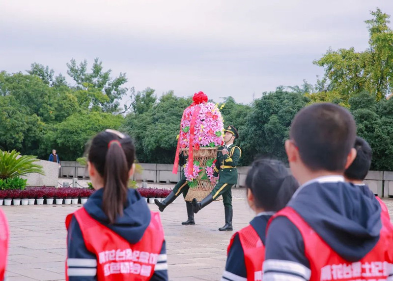 同学们首先进行了凭吊仪式。随着《义勇军进行曲》雄浑高亢的旋律响起,全体同学齐唱中华人民共和国国歌。在深情的《献花曲》中,礼兵托起由本次研学活动全体同学敬献的花篮,正步走向纪念碑。鲜艳的红掌、盛放的百合、轻盈的文心兰,寄托着同学们对革命烈士的无尽思念和崇高敬意。