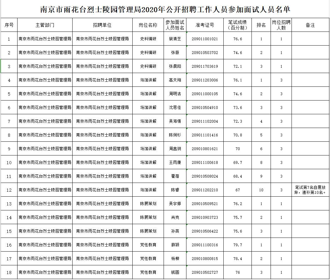 【公示】雨花台烈士陵园管理局2020年公开招聘工作人员参加面试人员名单
