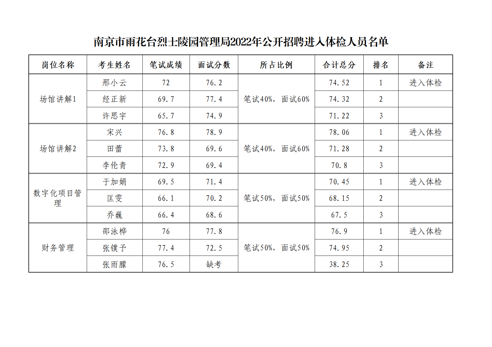 【公告】南京市雨花台烈士陵园管理局2022年公开招聘进入体检人员名单