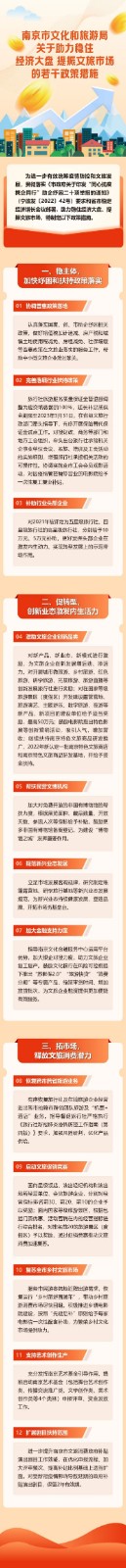为贯彻落实党中央、国务院和省市关于统筹疫情防控和经济发展的系列部署,切实把“疫情要防住、经济要稳住、发展要安全”重大要求落到实处,经市政府同意,在深入调研基础上,南京市文旅局近日印发实施《关于助力稳住经济大盘 提振文旅市场的若干政策措施》,出台加快扶持政策落实、促进业态创新转型、释放文旅消费潜力方面的12条举措,提振文旅企业信心,推动文旅企业尽快恢复运营、深入拓展市场。