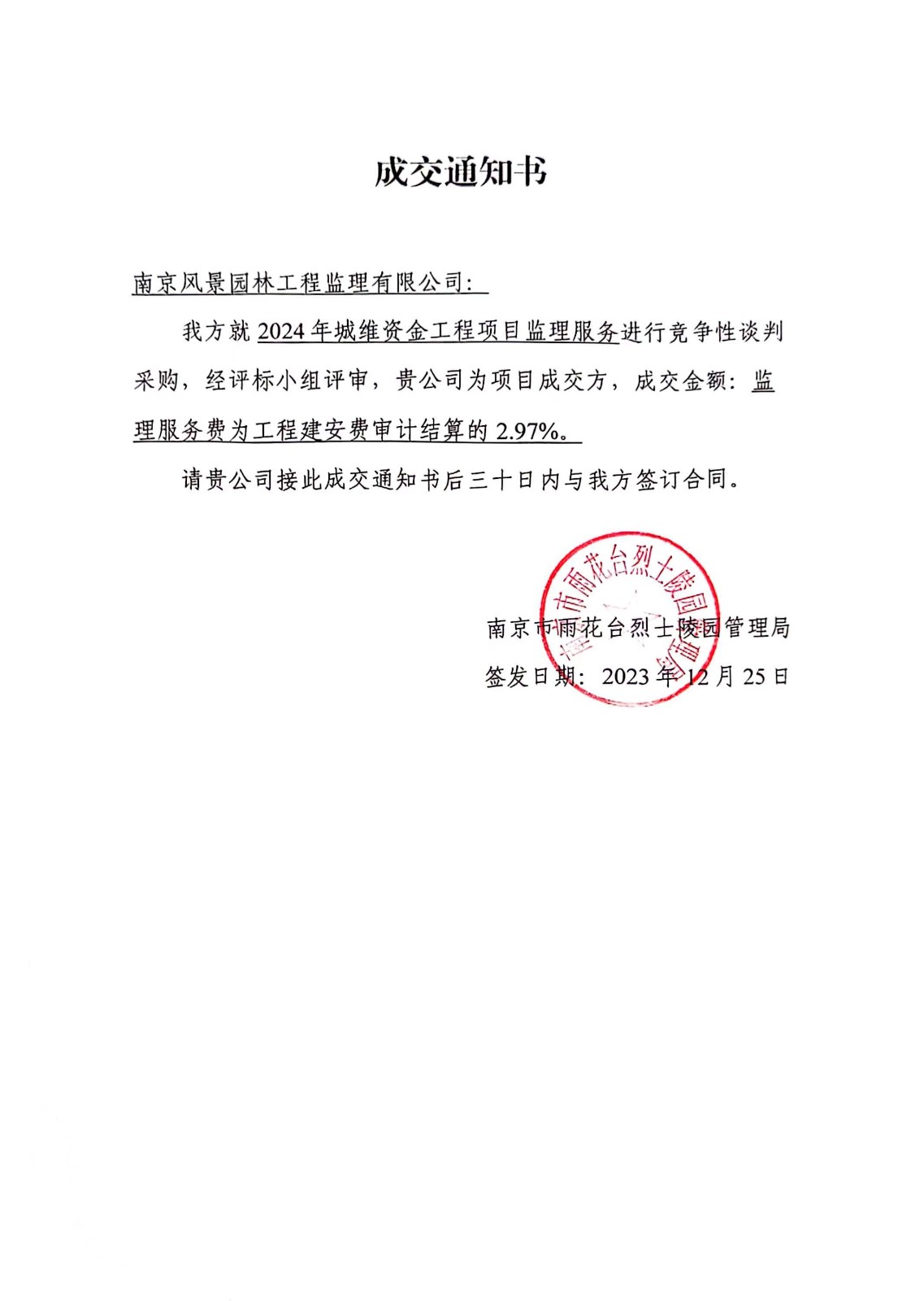 | 信息名称: | 2024年城维资金工程项目监理服务成交通知书 | ||