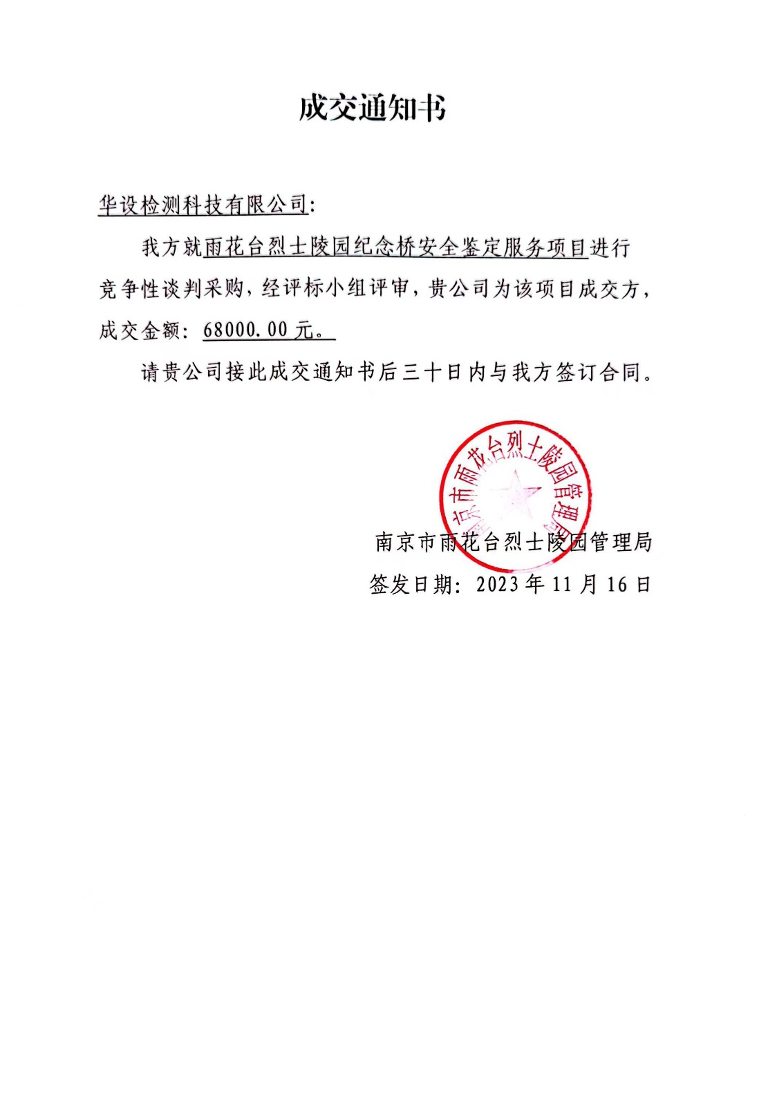 纪念桥安全鉴定服务成交通知书